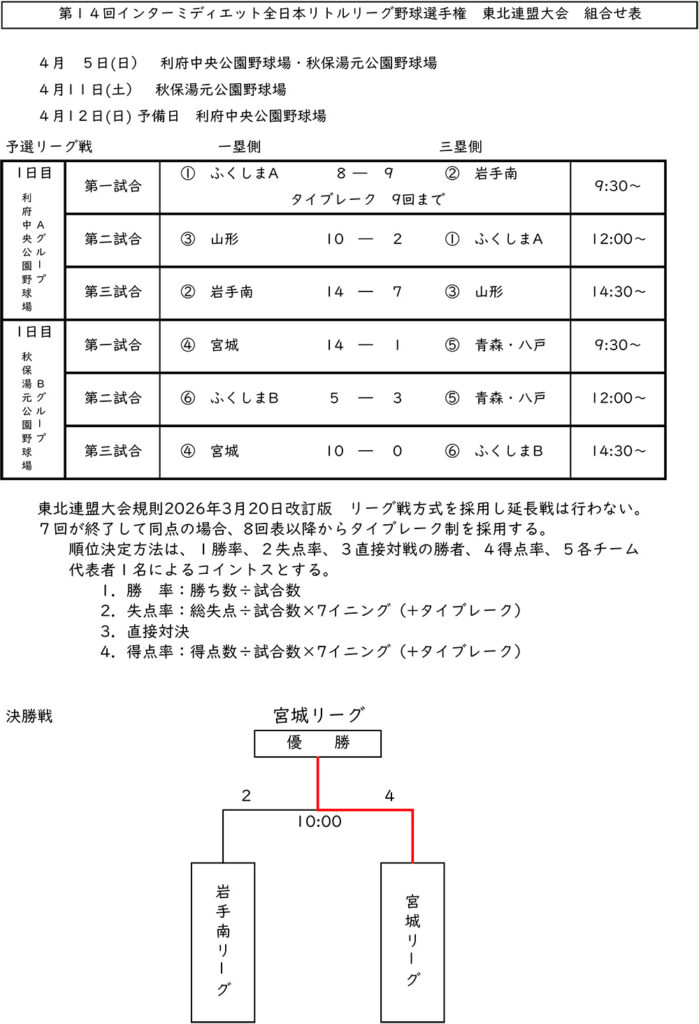 JA共済杯 第14回インターミディエット全日本リトルリーグ野球選手権 東北連盟大会が2026年 4月 5日(日) 、4月11日(土)、4月12日(日)に利府中央公園野球場、秋保湯元公園野球場、 秋保湯元公園野球場の各球場で開催されました。